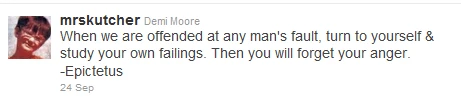 Однако сейчас дело становится серьёзнее. Девушка, с которой Катчер якобы переспал в день годовщины его с Деми свадьбы, встретилась со своим адвокатом, а Деми Мур в своём микроблоге цитирует Эпиктета: "Когда сталкиваешься с чьим-то проступком, повернись к себе и посмотри на свои проступки. Тогда забудешь свой гнев на него".